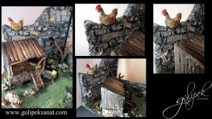 Kümes dioraması;Kağıdın tüm imkanlarını kullandım bu çalışmamda.( kağıt hamuru, mukavva, kağıt, oluklu mukavva ve karton)